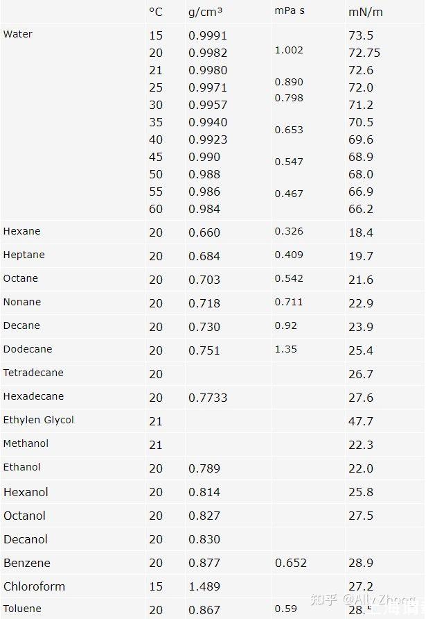 只有少數(shù)樣品可用于此類(lèi)試驗(yàn)測(cè)量。下表提供了一些此類(lèi)液體的重要數(shù)據(jù)。這些數(shù)值由不同的作者和方法確定,可以作為標(biāo)準(zhǔn)。