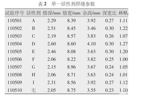 單一活性劑焊縫參數(shù)及無活性劑時焊縫參數(shù)如表2所示,表2單一活性劑焊縫參數(shù),圖1是單一活性劑熔深與無活性劑時熔深比直方圖。