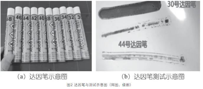 測試前先確定環(huán)境溫度、空氣濕度、以及被測物體表面溫度是否達到達因筆標定的標準條件(溫差越大,測量誤差越大)。測試方法圖2(b)所示塑料袋張力測試,當30mN/m筆測試時,在2 s內(nèi)達因筆潤濕了基材表面,沒有收縮或分散情況,說明表面張力等于或大于30 mN/m;當44 mN/m筆測試時,在2 s內(nèi)達因筆沒有潤濕了基材表面,出現(xiàn)收縮或分散水珠情況,說明表面張力小于44 mN/m。還可用大于30 mN/m筆測量,以此類推,直到測試結果在2 s內(nèi)改縮成水珠(球狀),則這測試之前一次的值被視為基材表面能,并作比較用。塑料袋PP材質在溫度20℃時表面張力是31~33 mN/m。達因筆使用方便,保質期為6個月。