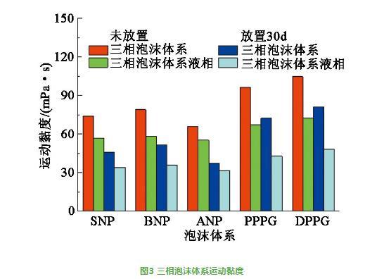 三相泡沫體系運(yùn)動(dòng)黏度見圖3??梢钥闯觯煌嗯菽w系運(yùn)動(dòng)黏度差別較大,DPCG體系的最大,PPCG、BNP、SNP和ANP體系的依次降低。放置30 d后DPCG或PPCG體系的運(yùn)動(dòng)黏度保留率接近77%,而BNP、SNP或ANP體系的保留率56%~65%。三相泡沫體系的運(yùn)動(dòng)黏度明顯大于其液相的。不同三相泡沫體系液相的運(yùn)動(dòng)黏度差別較小,其中DPCG或PPCG體系的較大,SNP、BNP或ANP體系的較小。放置30 d后DPCG或PPCG體系液相的運(yùn)動(dòng)黏度保留率接近66%,而BNP、SNP或ANP的保留率56%~61%。