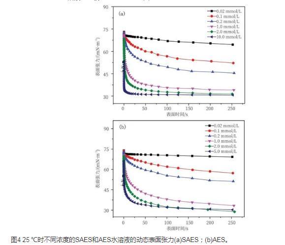 從圖4可以看出所測不同濃度不同表面活性劑的表面張力在初始階段均快速下降,一定時間后趨于平穩(wěn)狀態(tài)。這是因為動態(tài)表面張力測試過程中新形成的表面遠偏離于平衡態(tài),吸附層離子的濃度很低,體相與吸附層的濃度差大,因此動態(tài)表面張力變化很大。隨著吸附的進行,次表面濃度和表面濃度逐漸增大,擴散和吸附的速度均逐漸降低,動態(tài)表面張力隨著吸附時間的增加而降低的趨勢也逐漸變得平緩。當(dāng)表面活性劑濃度增大時,表面張力的下降幅度和速度也隨之增大,而且相應(yīng)地縮短了到達平衡狀態(tài)的時間。這種隨體系濃度的增加達到平衡所需的時間越短的趨勢與已經(jīng)報道的一些烷基表面活性劑的結(jié)果是相一致的。在相同濃度下,SAES表面張力下降的速率大于AES,這是由于SO4-在碳氫鏈中間的化合物比在端點者擴散速度快。