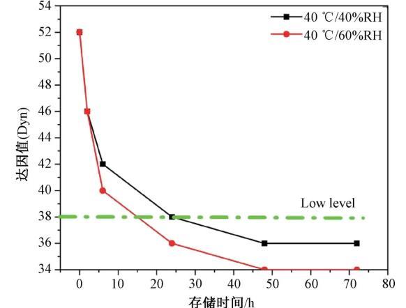 控制熟化溫度40℃,考察不同熟化濕度40%、60%下儲存不同時間耐候?qū)舆_因值的變化規(guī)律,如圖4所示。對比兩種濕度下達因值的下降趨勢,60%的濕度環(huán)境達因值下降較快,在約24 h后達因值即已下降至38 mN/m以下。40%的濕度環(huán)境可維持38 mN/m的水平至少24 h。因此為保證耐候?qū)舆_因值不低于38 mN/m,需嚴格控制所處環(huán)境濕度小于40%RH。