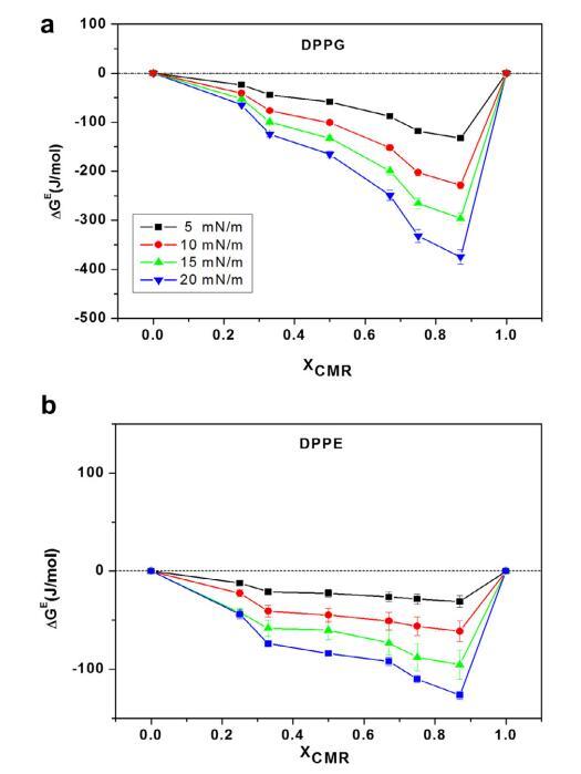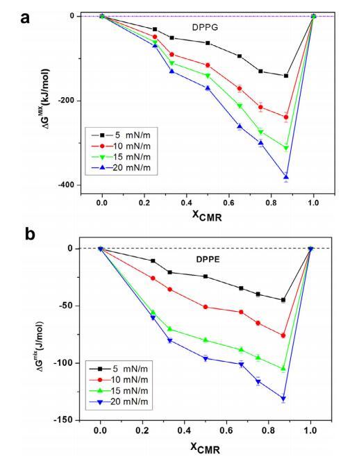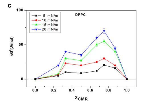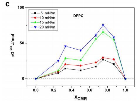 CMR/DPPG 混合膜的 ?Ge 和 ?Gmix 表示負 從 XCMR ≥ 0.25 到 XCMR = 1.0 的偏差(圖 7a 和 8a)。 ?Ge 和 ?Gmix 負值表明 CMR/DPPE 單層是 熱力學(xué)穩(wěn)定(圖 7b)。 ?Ge 和 ?Gmix 值為 DPPC 混合單層陽性,表明不混溶 (圖 7c 和 8c)。 分子之間的距離取決于 在導(dǎo)致排斥的磷脂頭部基團上 互動(邁爾斯,1999 年;博格斯,1987 年)。