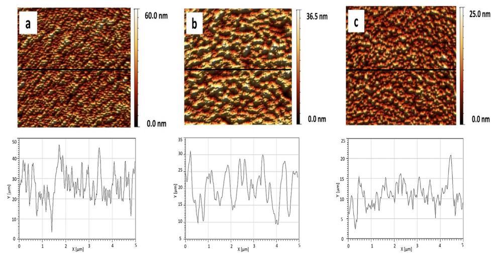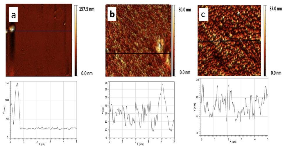 圖 9 顯示了純磷脂單層的 AFM 圖像 在 p = 20 mN/m 時轉(zhuǎn)移。 純磷脂顯示出均勻的 均方根 (rms) 等于 0.219 nm 的圖案, DPPG、DPPE 和 DPPC 分別為 0.060 nm 和 0.054 nm (圖 9)。 我們獲得了 rms ~ 0.045 nm (XCMR = 0.87) 相當于 光滑的單層形貌(圖 10a)。 另一方面, CMR/DPPE 和 CMR/DPPC 薄膜對應(yīng)于粗糙表面 rms 分別為 0.1754 nm 和 0.072 nm(圖 10b 和 c)。 測量重復(fù)三次,rms 的標準偏差約為 5%。