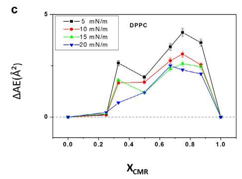 分子面積作為 CMR/ DPPG如圖5a所示。 可以看出負偏差 mma (XCMR = 0.33–0.67) 由于分子吸引力相互作用的增加。 CMR/DPPG 薄膜被認為是部分混溶和非理想的浮動單層,因為線性度不高 觀察到的。 CMR/DPPE 混合薄膜的結(jié)果在 XCMR=0.25 和 0.67 時表現(xiàn)出不同的斷裂點(圖 5b)。 DAE 節(jié)目 包裝效率甚至幾何形狀的改進 調(diào)節(jié)發(fā)生在較低的 XCMR(圖 6)(Andrade 等人, 2006; 周和張,2000)。