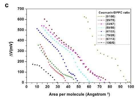 作為函數(shù)分子面積 (ΔVA) 的表面電位為 如圖3a所示。 為所有研究的磷脂獲得的 ?V 值 與之前的報告相似(Andrade et al., 2006; Nowotarska 等,2014)。 ?V(460 mV 至 275 mV)逐漸降低 對于 DPPG,觀察到 CMR 摩爾分數(shù)的函數(shù)。 ?V 易受極性和非極性基團的取向影響。