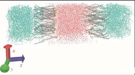 在進(jìn)行分子動(dòng)力學(xué)模擬之前構(gòu)建出合理的力場是極為重要的工作。本文通過Autom-ated Topology Builder(ATB)and repository生成的GROMOS系列力場參數(shù),利用現(xiàn)有的數(shù)據(jù)庫以及量子化學(xué)進(jìn)行計(jì)算,同時(shí)它可以充分考慮到分子中的對(duì)稱結(jié)構(gòu),使其反映出的分子性質(zhì)及參數(shù)更為精確。但ATB只能處理原子數(shù)小于40的分子,對(duì)于分子數(shù)大于40的分子結(jié)構(gòu)需進(jìn)行拆分。在獲取準(zhǔn)確的電荷及鍵參數(shù)之后利用packmol程序定向排列分子將其堆砌成立方體結(jié)構(gòu)。此外,本文選取的油-水界面需使表面活性劑平均分布在水相兩側(cè),親水基靠近水相,疏水基靠向油相。圖2為初始狀態(tài)下體系截圖,其中中間紅色部分為水分子,左右兩側(cè)藍(lán)色部分為癸烷分子,油水中間即OPES分子。