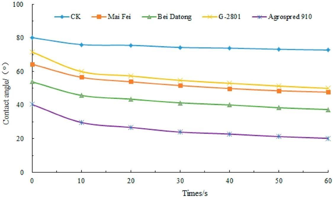 圖2.水和不同助劑溶液在荔枝葉上隨時(shí)間變化的接觸角。
