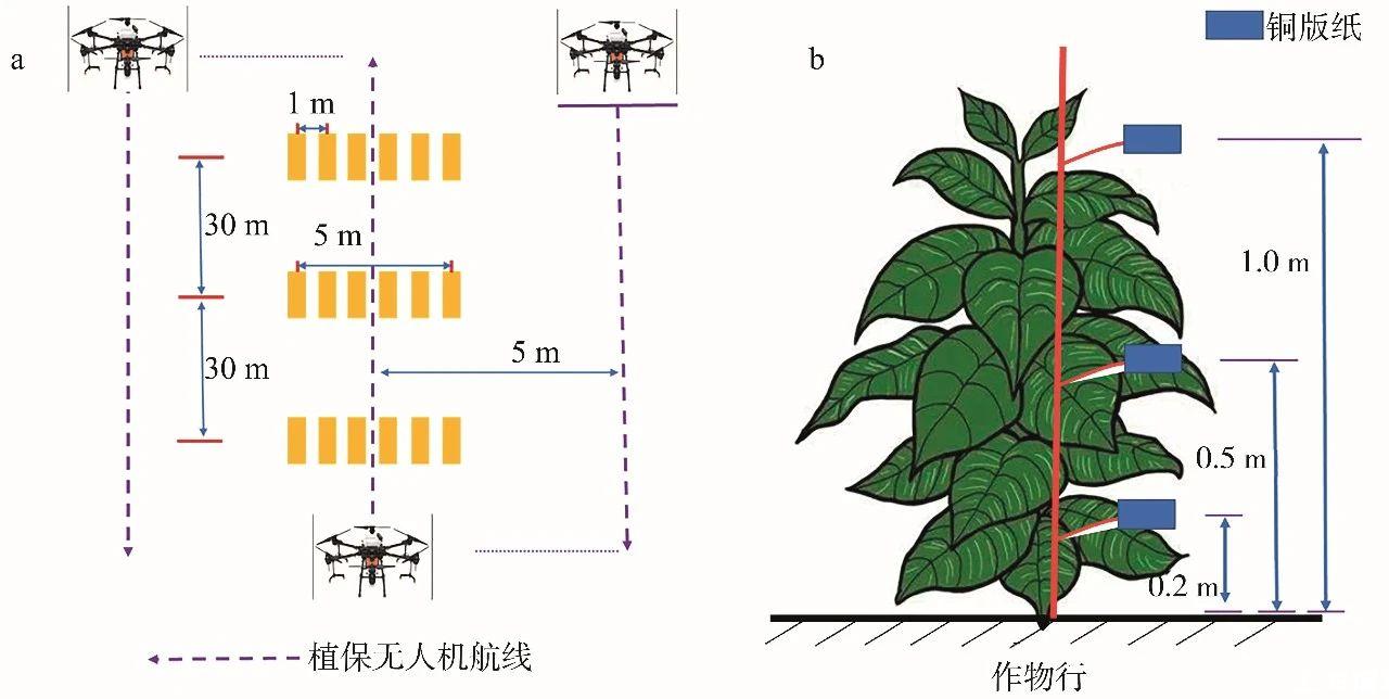 試驗時無人機采用常規(guī)往復(fù)施藥模式進(jìn)行噴霧作業(yè),各條航線之間間隔為5.0 m,試驗地塊開闊無遮擋,且煙草長勢較為一致。試驗前,在各處理小區(qū)中間地帶布置3排間隔為30.0 m的霧滴采集帶,每條霧滴采集帶含6個霧滴采集點,每個采集點間隔1.0 m,總長度5.0 m(圖1a)。每個霧滴采集點處插一根采樣桿,用雙頭夾將銅版紙固定在采樣桿上。設(shè)置上、中、下3層采樣位置,分別距地面1.0、0.5和0.2 m(圖1b)。用于測定煙草上、中、下冠層的霧滴密度和覆蓋率。噴霧結(jié)束后,待銅版紙上的霧滴自然晾干后收取并裝入自封袋帶回實驗室。
