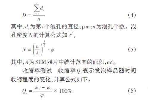 其中,A為SEM照片中統(tǒng)計(jì)范圍的面積,m2。收縮率測(cè)試收縮率Qi表示發(fā)泡樣品隨時(shí)間收縮程度的變化,計(jì)算公式如下。