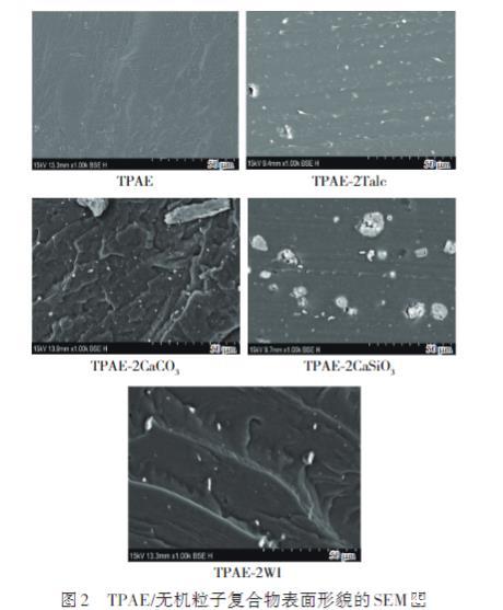 對比之下,含有CaSiO3、CaCO3、WI無機粒子的TPAE復(fù)合材料展示出典型的兩相形態(tài),這些粒子在TPAE基體中的均勻分散揭示了TPAE與這3種無機粒子之間在熱力學(xué)上的不相容性。值得注意的是,相比較于TPAE-2CaCO3和TPAE-2WI,TPAE-2CaSiO3復(fù)合材料的斷面形貌中的CaSiO3粒子表現(xiàn)出明顯的團聚現(xiàn)象,這可歸因于CaSiO3獨特的多孔蜂窩狀結(jié)構(gòu),使得在含量增加時,粒子間相互碰撞并傾向于結(jié)合,容易形成更大的聚集體,使得CaSiO3粒子尺寸顯著大于其他兩種無機粒子。