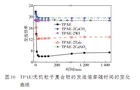 圖10 TPAE/無機(jī)粒子復(fù)合物的發(fā)泡倍率隨時間的變化曲線