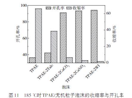圖11 185℃時TPAE/無機(jī)粒子泡沫的收縮率與開孔率