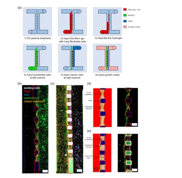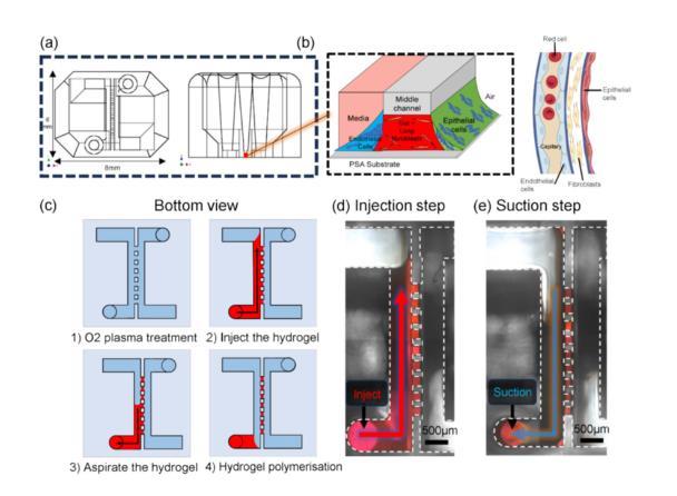 圖1展示了一個基于表面張力的開放式微流體平臺的結(jié)構(gòu)和液體圖案化過程,用于再現(xiàn)肺部的三維細(xì)胞微環(huán)境。圖1a展示了微流體平臺的頂視圖和側(cè)視圖。平臺的中心區(qū)域包含微柱陣列,用于形成薄的水凝膠膜,兩側(cè)是包含不同細(xì)胞懸浮液的流體通道。圖1b展示了水凝膠和不同細(xì)胞層的位置安排,模擬肺部細(xì)胞環(huán)境的氣-液界面結(jié)構(gòu)。圖1c到圖1e展示了圖案化過程的兩個關(guān)鍵步驟——液體注入和保持。首先,水凝膠液體通過微柱流動;當(dāng)液體達(dá)到通道的擴(kuò)展區(qū)域時,使用吸取器將多余液體移除,剩余部分被保持在微柱之間形成所需的薄層。這一過程中利用了表面張力的“毛細(xì)釘扎”現(xiàn)象,即通過幾何結(jié)構(gòu)和表面特性來控制液體的流動和停留。