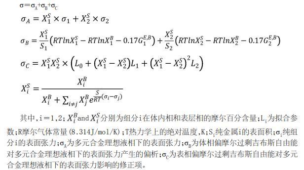 其中,i=1,2,3,……,n;and分別為組分i在體內(nèi)相和表層相的摩爾百分含量;R摩爾氣體常量(8.314J/mol/K);T熱力學(xué)上的絕對溫度,K;Si純金屬i的表面積;σi純組分i的表面張力;σA為多元合金理想液相下的表面張力;σB為體相偏摩爾過剩吉布斯自由能對多元合金理想液相下的表面張力產(chǎn)生的偏析;σC為表相偏摩爾過剩吉布斯自由能對多元合金理想液相下的表面張力影響的修正項(xiàng)。