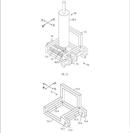 如圖13所示,滑動座72包括第一U形板72-1、第二U形板72-2、蓋形板72-3、第一尾板72-4、以及第二尾板72-5。第一U形板72-1和第二U形板72-2的開口端都與蓋形板72-3的左側(cè)面(即里側(cè)面)固定連接,并且第一U形板72-1和第二U形板72-2均與蓋形板72-3相垂直,其中蓋形板72-3沿豎直方向延伸且蓋形板72-3上設(shè)置有通孔72-8,第一U形板72-1和第二U形板72-2均沿水平方向延伸;第一U形板72-1位于第二U形板72-2的上方,第一U形板72-1與第二U形板72-2相互平行且二者之間設(shè)置有一個縫隙72-9。在本實(shí)施例中,第一U形板72-1與第二U形板72-2相同。