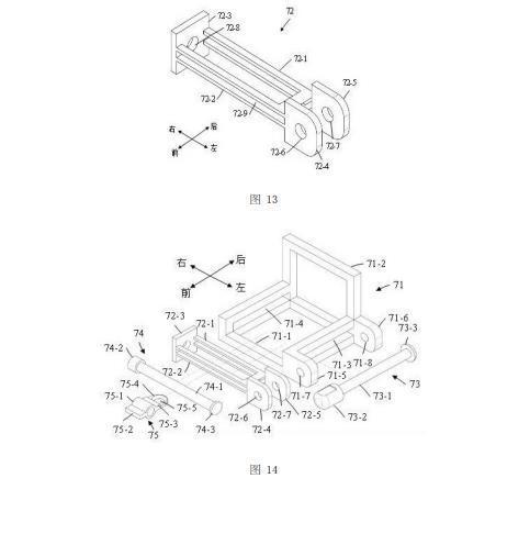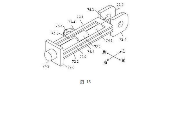 如圖10、圖11和圖14所示,滑動座72活動設(shè)置于固定座71上?;瑒幼?2的第一U形板72-1和第二U形板72-2的左端均穿入固定座71的左邊框的第一方孔71-3內(nèi),第一U形板72-1和第二U形板72-2的右端均穿入固定座71的右邊框的第二方孔71-4內(nèi);蓋形板72-3的左側(cè)面與固定座71的右邊框的右側(cè)面相抵接,使得蓋形板72-3對滑動座72起限位作用;第一尾板72-4和第二尾板72-5的右端面均與固定座71的左邊框的左側(cè)面相抵接,使得第一尾板72-4和第二尾板72-5對滑動座72起限位作用,并且第一尾板72-4和第二尾板72-5均位于第一延伸板71-5與第二延伸板71-6之間。