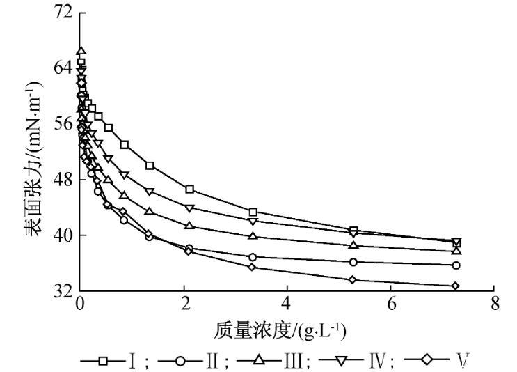 由表1可知,5種高分子表面活性劑的重均相對分子質(zhì)量在1 643~5 267之間,萜烯馬來酸酐與聚乙二醇2 000反應(yīng)得到的表面活性劑重均相對分子質(zhì)量最大,表面活性劑的聚合度隨著聚乙二醇相對分子質(zhì)量的增大呈先增大后減小的趨勢,化合物Ⅱ聚合度最大,為4.9。