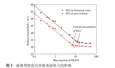 由圖3還可知,SRA在去離子水中混合時(shí),臨界SRA濃度約為11.2%,當(dāng)SRA在合成孔溶液中混合時(shí),臨界SRA濃度約為7.3%.這意味著溶液中的離子會(huì)使得臨界SRA濃度降低。對于混凝土,實(shí)際的內(nèi)部離子濃度更高,而臨界SRA濃度取決于孔隙溶液的離子組成,因此,實(shí)際的臨界SRA濃度更低。