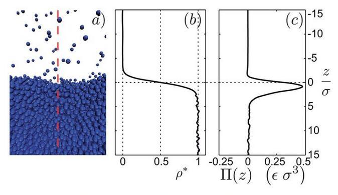 當(dāng)分子間距較小時,斥力為主,分子間距較大時,引力為主。在斥力與引力平衡時,Lennard-Jones勢能最小?,F(xiàn)在,我們就可以來詳細(xì)地考慮液-氣界面了。圖5a是通過分子動力學(xué)仿真得出的液-氣界面照片,對應(yīng)的時間平均密度分布圖是圖5b。從高密度的液體到低密度的氣體發(fā)生在一個幾個分子厚度的窄區(qū)域。為了確定毛細(xì)力,我們沿垂直界面方向?qū)⑾到y(tǒng)分為兩個子系統(tǒng)(圖5a)??紤]左邊子系統(tǒng)對右邊子系統(tǒng)的單位面積的作用力,即應(yīng)力,在豎直方向上的分布。這個力有兩個來源:壓力P和額外壓力Π(圖5c)。圖5c表明有個力局部存在于界面附近,其實這個力就是表面張力,且這個力范圍和密度突變的范圍很相似。這說明表面張力的確是一個真實的力,而不僅僅是表面能的一種純數(shù)學(xué)描述。既然我們發(fā)現(xiàn)在界面附近的確局部存在一個平行的力,那我們回到問題1,為什么表面張力平行于界面而不是垂直于界面?我們注意到圖1僅僅描繪了分子間引力作用。更全面的圖應(yīng)該如圖6所示,包含了引力與斥力作用。在遠(yuǎn)離界面的液體本體內(nèi),由于液體分子周圍的完全對稱性,分子的受力完全平衡。但是,靠近界面附近的地方,上下對稱性被打破。為修復(fù)豎直方向的力平衡,向上的斥力需平衡向下的引力。而在平行于界面的方向,對稱性仍然存在,平行于界面方向的力平衡仍然存在。這就可以存在一種情況,引力作用的強度與斥力作用的強度不同。實際上,在界面附近的水平方向上,引力作用比斥力更強,這產(chǎn)生了表面張力。