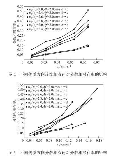 圖2和圖3給出了不同的傳質(zhì)方向,分散相滯存率隨著連續(xù)相和分散相流速增加的變化情況。從圖中可以看出,流速的增加會使分散相滯存率增加。圖2中相比L大的分散相滯存率更大,這是由于連續(xù)相流速相同時,相比較大,分散相流速就大,流速的增加會加劇流體的湍動,促進液滴破碎,故而分散相滯存率增大。而圖3中,分散相滯存率的變化趨勢發(fā)生變化,對于傳質(zhì)方向由分散相到連續(xù)相(d→c),當(dāng)ud<0.08 cm/s時,x(L=2.8)>x(L=2.0)>x(L=2.4)>x(L=2.6);當(dāng)ud>0.08 cm/s時,x(L=2.0)>x(L=2.8)>x(L=2.4)>x(L=2.6)。這是由于當(dāng)分散相流速一定時,相比越大意味著連續(xù)相流速越小,流體湍動程度越小,分散相滯存率相應(yīng)會降低,因此在分散相流速大于0.08cm/s時,相比2.8、2.6和2.4的分散相滯存率低于相比2.0。