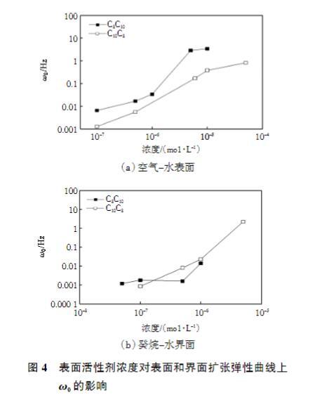 圖4表面活性劑濃度對表面和界面擴張彈性曲線上ω0的影響