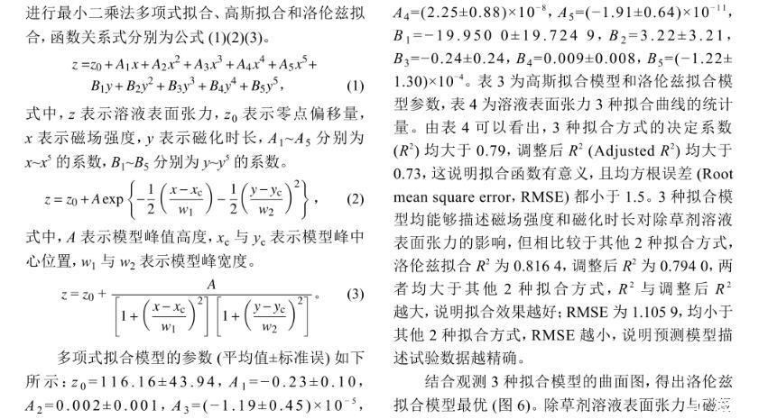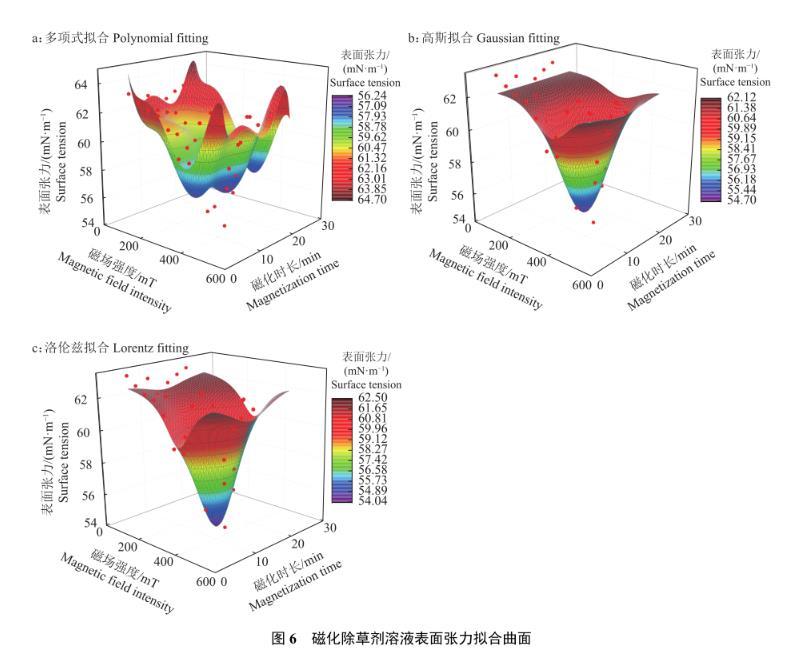 結(jié)合觀測3種擬合模型的曲面圖,得出洛倫茲擬合模型最優(yōu)(圖6)。除草劑溶液表面張力與磁場強(qiáng)度和磁化時(shí)長的關(guān)系式見公式(4),為研究磁化作用對除草劑溶液表面張力的影響提供理論參考。