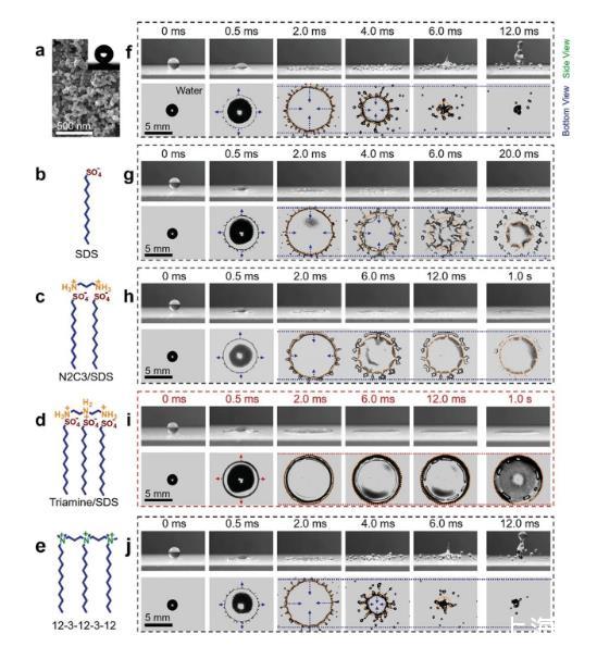 圖1.高速液滴撞擊超疏水表面的動(dòng)態(tài)行為。a)掃描電子顯微鏡(SEM)揭示了表面的微觀結(jié)構(gòu)。插圖:水接觸角為161.3±1.1°,確保超疏水性。b–e)表面活性劑的分子結(jié)構(gòu)。f)撞擊超疏水表面的水滴出現(xiàn)飛濺和反彈。g–j)分別含有SDS、N2C3/SDS、三胺/SDS和12-3-12-3-12添加劑的水滴在超疏水表面上的撞擊動(dòng)力學(xué)的側(cè)面和仰視圖。g,h)含有SDS或N2C3/SDS添加劑的液滴抑制了反彈,但仍會(huì)產(chǎn)生飛濺或后退破碎。i)含有三胺/SDS的液滴一旦與基材接觸就會(huì)形成穩(wěn)定的周邊邊緣,隨后完全沉積在超疏水表面上而不會(huì)發(fā)生任何飛濺或碎裂。完全均勻的潤濕膜在達(dá)到最大擴(kuò)散面積后保持不變。j)合成低聚表面活性劑12-3-12-3-12添加劑對(duì)水滴的影響影響不大。濺射和反彈仍然會(huì)發(fā)生。箭頭的長度表示擴(kuò)散或反彈速度的變化。