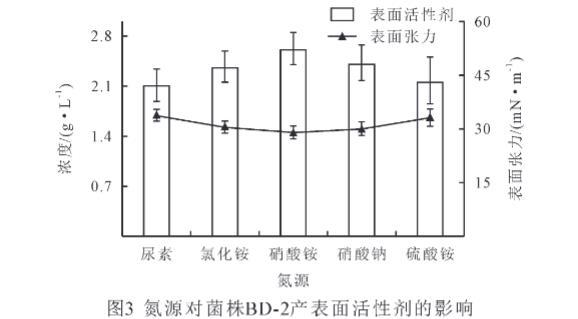 碳源對微生物的生長和次生代謝產(chǎn)物的產(chǎn)生有重要的影響。由圖2可知,不同碳源對菌株BD-2產(chǎn)表面活性劑量的影響不同,本實驗將原油、礦物油作為一類復(fù)雜碳源,葡萄糖、麥芽糖、蔗糖作為簡單碳源,進行對比分析發(fā)現(xiàn),以簡單碳源作為底物時,菌株BD-2產(chǎn)表面活性劑的量顯著高于復(fù)雜碳源(P<0.05),其產(chǎn)表面活性劑量大小依次為葡萄糖>麥芽糖>蔗糖>原油>礦物油。同時以簡單碳源為底物時,菌株BD-2能顯著降低發(fā)酵液表面張力(P<0.05),其發(fā)酵液表面張力大小依次為原油>礦物油>蔗糖>麥芽糖>葡萄糖。在簡單碳源中,以葡萄糖為碳源時,菌株BD-2產(chǎn)生的表面活性劑的量最高,為2.26 g/L,而表面張力最低,為32.7 mN/m。研究結(jié)果表明,簡單碳源有利于菌株BD-2產(chǎn)表面活性劑。因此,選擇葡萄糖為菌株BD-2的碳源。