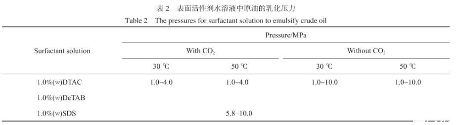 實(shí)驗(yàn)中觀察到原油的乳化情況與體系壓力及CO2存在與否的相關(guān)性,表2是CO2存在與CO2不存在條件下,1.0~10.0 MPa范圍內(nèi),表面活性劑水溶液中原油的乳化壓力。50℃時(shí),在DTAC水溶液/原油體系中,CO2不存在時(shí),水靜壓在1.0~10.0 MPa范圍內(nèi),始終存在原油的乳化現(xiàn)象。CO2存在時(shí),體系壓力低于4.0 MPa時(shí),存在原油的乳化現(xiàn)象,隨著CO2壓力升高,油水界面張力增大,原油乳化現(xiàn)象消失。說(shuō)明在DTAC水溶液/原油體系中,CO2的存在不利于原油的乳化。50℃時(shí),在SDS水溶液/原油體系中,CO2不存在時(shí),水靜壓從1.0 MPa升高至10.0 MPa過(guò)程中,始終未出現(xiàn)原油的乳化現(xiàn)象。CO2存在時(shí),體系壓力升高到5.8 MPa以上,原油開始出現(xiàn)乳化、拉絲的現(xiàn)象。這說(shuō)明CO2的存在有利于SDS水溶液乳化原油。其原因如下:一方面CO2的存在降低了SDS水溶液與原油的界面張力;另一方面,CO2通過(guò)水相擴(kuò)散進(jìn)入原油中,降低了原油的黏度,增強(qiáng)了原油的流動(dòng)性,同時(shí)CO2對(duì)原油中輕質(zhì)組分的萃取,也有助于原油中的輕質(zhì)組分?jǐn)U散進(jìn)入水相。因此高壓CO2增強(qiáng)了SDS水溶液對(duì)原油的乳化作用。在DeTAB水溶液/原油體系中,油水界面張力較大,無(wú)論CO2存在與否,始終沒有原油乳化現(xiàn)象的發(fā)生。