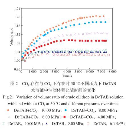 圖2 CO2存在與CO2不存在時(shí)50℃不同壓力下DeTAB水溶液中油滴體積比隨時(shí)間的變化