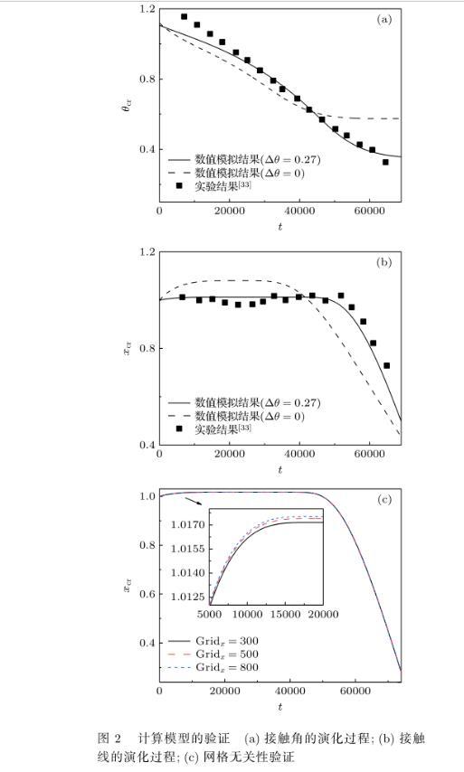 圖2計(jì)算模型的驗(yàn)證(a)接觸角的演化過(guò)程;(b)接觸線的演化過(guò)程;(c)網(wǎng)格無(wú)關(guān)性驗(yàn)證