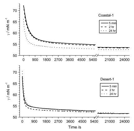 1:1 提取物的動(dòng)態(tài)表面張力測(cè)量 表明達(dá)到平衡的時(shí)間 γLV 從大約 15 分鐘到長(zhǎng)達(dá) 5 小時(shí)不等(圖 1)。 在所有情況下,都有一個(gè)相對(duì)較快的初始速度 γLV 的變化,這可能是擴(kuò)散受限的,和 然后是一段長(zhǎng)時(shí)間的低利率 γLV 的變化。 平衡達(dá)到率低的時(shí)期被假定為至少兩個(gè)過程的結(jié)果:(i)不同分子之間的表面競(jìng)爭(zhēng) 吸附位點(diǎn); (ii) 表面分子的重排。 時(shí)間之間沒有明顯的關(guān)系 實(shí)現(xiàn)不同的平衡 γLV 和提取時(shí)間 土壤(圖 1)。