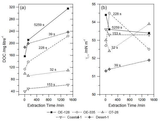 圖2 土壤溶解有機(jī)碳(DOC)含量(a)和表面張力(γLV)(b) 提取作為提取時(shí)間的函數(shù)。 水 以秒為單位的液滴穿透時(shí)間 (WDPT) 是 標(biāo)在面板上。