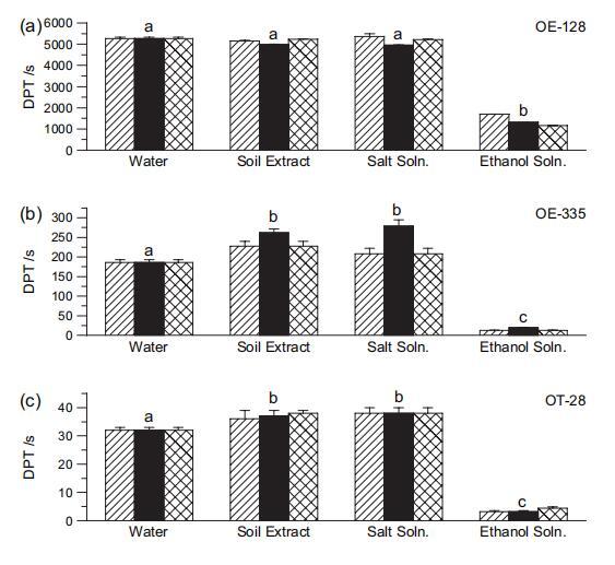 圖 3 液滴穿透時(shí)間 (DPT) 水、1:1 土壤提取物、鹽溶液和不同土壤的乙醇溶液:(a) OE-128; (b) OE-335; (c) OT-28; (d) Coastal-1; (e) 沙漠-1。 誤差線顯示標(biāo)準(zhǔn)偏差 復(fù)制滴。 小寫字母給出 兩側(cè) t 檢驗(yàn)的結(jié)果。 在給定的 窗格中,不同的字母表示均值 在 P ? 0.01 顯著差異 癌癥水平。 對(duì)于 t 檢驗(yàn),結(jié)果為 三個(gè)提取時(shí)間(5 分鐘、2 小時(shí)和 24 小時(shí))一起考慮,因?yàn)樗鼈兊?γLV 值非常相似(圖 2b)。