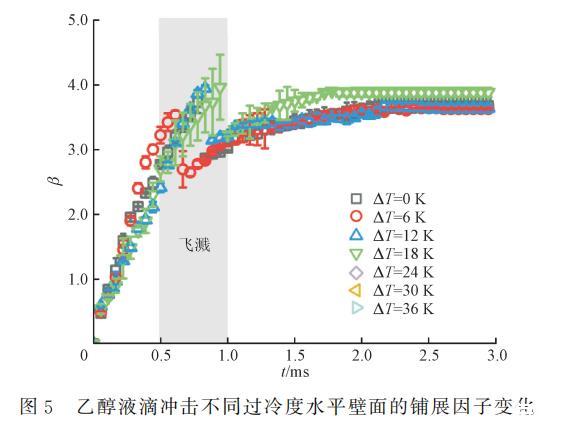為了探究水平壁面過冷度對液滴沖擊的影響機制,定義無量綱鋪展因子β=D(t)/D0,其中D(t)為液滴每一時刻的直徑,Dmax為液滴能達到的最大鋪展直徑,對應的最大鋪展因子為βmax=Dmax/D0。圖5展示了不同水平壁面過冷度下,乙醇液滴沖擊水平壁面的鋪展因子β隨時間的變化曲線??梢钥闯?,乙醇液滴沖擊不同過冷度水平壁面均在1.0ms內發(fā)生破碎-飛濺,在這段時間內,鋪展速率近似為線性,在飛濺后,β突然減小,隨后鋪展因子繼續(xù)增,鋪展速率逐漸減小,最終趨于0,液滴形態(tài)不再發(fā)生變化。