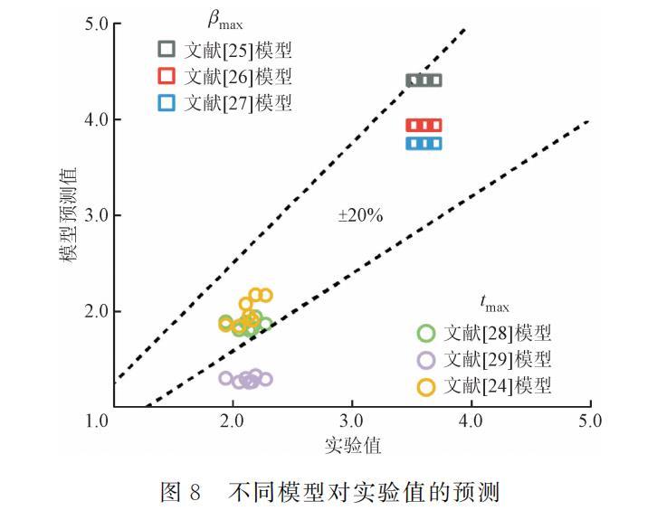 式中:tmax,pre和βmax,pre為使用各模型的最大鋪展時(shí)間和最大鋪展因子預(yù)測(cè)值;tmax,exp和βmax,exp為最大鋪展時(shí)間和最大鋪展因子實(shí)驗(yàn)值。如圖8所示,不同公式的預(yù)測(cè)結(jié)果不同,對(duì)于最大鋪展因子,盡管不同學(xué)者提出的表達(dá)式對(duì)實(shí)驗(yàn)結(jié)果的預(yù)測(cè)準(zhǔn)確率均較好,單個(gè)數(shù)據(jù)點(diǎn)的偏差均在20%以內(nèi),然而由于表達(dá)式的限制,無法針對(duì)液滴沖擊不同水平壁面過冷度的實(shí)驗(yàn)工況進(jìn)行預(yù)測(cè),存在一定缺陷。對(duì)于最大鋪展時(shí)間,Huang和Chen等人提出的表達(dá)式預(yù)測(cè)效果較差,Wildeman等提出的表達(dá)式預(yù)測(cè)效果較好,相對(duì)平均偏差為12.32%,但由于其表達(dá)式內(nèi)不包含水平壁面過冷度的影響因素,因而預(yù)測(cè)效果略差于Shang等提出的表達(dá)式,其相對(duì)平均偏差為6.05%。綜上所述,現(xiàn)有最大鋪展時(shí)間的表達(dá)式能較好預(yù)測(cè)乙醇液滴沖擊過冷水平壁面的鋪展動(dòng)力學(xué)行為,但最大鋪展因子表達(dá)式仍需進(jìn)一步探索。