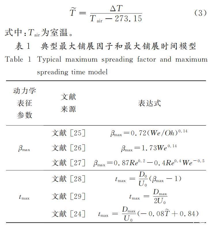 如表1所示,Bayer和Megaridis認(rèn)為液滴沖擊水平壁面的最大鋪展因子與韋伯?dāng)?shù)、奧內(nèi)佐格數(shù)有關(guān),并提出了相關(guān)關(guān)聯(lián)式。Roisman認(rèn)為最大鋪展因子與雷諾數(shù)、韋伯?dāng)?shù)均有關(guān),他采用半假設(shè)半理論的方法,從動(dòng)量守恒理論出發(fā),提出了最大鋪展因子的表達(dá)式。針對(duì)最大鋪展時(shí)間,Wildeman等認(rèn)為,最大鋪展時(shí)間與最大鋪展因子有關(guān),結(jié)合實(shí)驗(yàn)數(shù)據(jù),對(duì)最大鋪展時(shí)間進(jìn)行了修正。Shang等探究了水滴沖擊過冷水平壁面的鋪展動(dòng)力學(xué)行為,并將水平壁面過冷度引入最大鋪展時(shí)間模型,重新定義無量綱過冷溫度