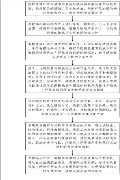 獲取玻璃纖維網格布的表面形貌結構參數(shù)和化學性質參數(shù),根據(jù)預設的浸膠工藝參數(shù)閾值,判斷纖維表面的浸潤性和親和力,確定初始浸膠量范圍;在玻璃纖維網格布表面進行等離子體處理,引入親水性基團,提高纖維表面能,增強與膠液的親和力,在低浸膠量的情況下實現(xiàn)高浸膠充分性;根據(jù)玻璃纖維網格布的纖維直徑、纖維間距等結構參數(shù),采用有限元分析方法,模擬不同浸膠量下膠液在纖維表面的鋪展狀態(tài)和纖維束內部的滲透深度,獲得浸膠量與浸膠充分性的定量關系;基于上述浸膠量與浸膠充分性的定量關系,通過改變膠液配方中的助劑種類和用量,調控膠液的黏度和表面張力,獲得不同浸膠量下膠液分布均勻性的變化規(guī)律,結合浸膠充分性的要求,確定最佳膠液配方,膠液分布均勻性通過光學顯微鏡觀察和圖像分析軟件定量計算膠液在纖維表面的覆蓋率和厚度分布來描述;針對確定的最佳膠液配方和不同浸膠量,采用正交試驗設計方法,優(yōu)化浸膠時間、浸膠次數(shù)等工藝參數(shù),通過拉伸強度、耐堿性、彎曲強度、剪切強度性能測試,篩選出浸膠量與工藝參數(shù)的最佳匹配方案;采用數(shù)值模擬與機器學習相結合的方法,建立浸膠量、膠液性能、纖維表面性質、浸膠工藝參數(shù)與浸膠效果之間的非線性預測模型,通過優(yōu)化算法尋找各參數(shù)的最優(yōu)組合,指導浸膠量的精確控制,浸膠效果包括浸膠充分性、膠液分布均勻性、纖維束內部滲透深度和最終復合材料的力學性能指標;在實際生產中,根據(jù)預測模型設定浸膠量和工藝參數(shù),通過在線監(jiān)測膠液黏度、表面張力等參數(shù),并結合機器視覺對浸膠后網格布表面形貌的檢測,實現(xiàn)浸膠量的實時反饋控制,確保浸膠質量的穩(wěn)定性。