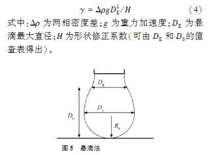 Jyoti等使用軸對稱液滴形狀分析法(axisymmetricdropshapeanalysis,ADSA)研究單層壓縮速率對表面張力?表面積等溫線形狀的影響。懸滴法(見圖5)可認(rèn)為是ADSA的雛形,其通過Laplace方程應(yīng)用于液滴輪廓來確定懸垂液滴的表面張力和接觸角,懸滴法實質(zhì)上是滴外形法的一種。滴外形法的基本原理是:當(dāng)液滴在管口形成時,液滴形狀與表面張力存在一定的關(guān)系。懸滴法測量表面張力可由下列公式計算:γ=ΔρgD2E/H(4)式中:Δρ為兩相密度差;g為重力加速度;DE為懸滴最大直徑;H為形狀修正系數(shù)(可由DE和DS的值查表得出)。