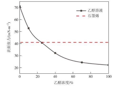 但是NMP存在價(jià)格昂貴、環(huán)境污染大的缺點(diǎn),因此尋求一種環(huán)境友好、成本低的球磨溶劑對(duì)微晶石墨細(xì)化產(chǎn)業(yè)化具有重要的意義。水和乙醇的表面張力分別為70.95 mN·m-1和22.17 mN·m-1,我們采用一定體積比的乙醇和水調(diào)配出與微晶石墨表面能接近的乙醇水溶液,并以此為溶劑球磨微晶石墨,研究溶劑的表面張力對(duì)球磨后微晶石墨粒徑的影響。從圖1可知,25%乙醇溶液的表面能為40.69 mN·m-1,與石墨烯的表面能(40.80 mN·m-1)相近,從圖2可知,其對(duì)應(yīng)的微晶石墨中位粒徑最小。當(dāng)溶劑的表面能與微晶石墨表面能相近時(shí),微晶石墨能更好地分散在溶劑中,從而提高球磨效率。所以在本工作中,選擇25%的乙醇水溶液作為球磨溶劑。