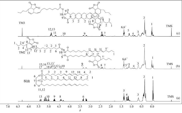 桐油中的共軛不飽和鍵與馬來酸酐易發(fā)生Diels-Alder(D-A)反應(yīng),生成桐油酸酐,反應(yīng)條件對產(chǎn)物的分布具有重要影響。由于桐油為混合物,每分子中有3條不飽和鏈,控制MA的加入量及反應(yīng)條件,可以控制桐油二酸酐(TM2)和桐油三酸酐(TM3)的形成。文獻報道大多數(shù)桐油和馬來酸酐反應(yīng)以有機錫為催化劑,經(jīng)過研究發(fā)現(xiàn),溫度對馬來酸酐與桐油反應(yīng)影響較大,溫度低反應(yīng)很慢,有機錫催化劑并不能明顯降低反應(yīng)溫度。在無催化劑的條件下,以紅外光譜跟蹤80℃、100℃、120℃及140℃下桐油與3倍量的馬來酸酐反應(yīng)的情況,結(jié)果表明80℃下反應(yīng)緩慢,100℃反應(yīng)1h后桐油的共軛三鍵的紅外吸收峰幾乎完全消失,反應(yīng)程度能達到96%。桐油及桐油酸酐的FTIR如圖1所示,991cm–1為桐油共軛三鍵的面外彎曲振動紅外吸收峰,兩倍量馬來酸酐與桐油反應(yīng)的產(chǎn)物(TM2)中991cm–1的吸收峰明顯減弱但未消失,3倍量馬來酸酐與桐油反應(yīng)的產(chǎn)物中該峰完全消失,說明桐油分子上的共軛三鍵可以同馬來酸酐反應(yīng)形成三酸酐TM3。
