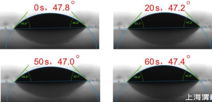 圖61 g/L的C72-MPB水溶液在PTFE上不同時間的潤濕狀態(tài)