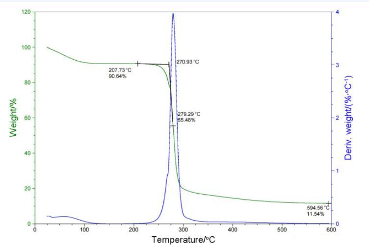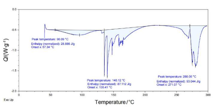 TGA圖中可以看到樣品的失重主要集中在100℃以下和250℃到300℃,DSC圖中可以看出樣品的吸熱主要有三個區(qū)域,分別在100℃以下,140——170℃和260——300℃。結(jié)合TGA和DCS來看,在溫度100℃以下部分是少量溶劑及產(chǎn)物中的水蒸發(fā),溫度達(dá)到140℃時,DSC中有吸熱峰,但TGA曲線沒有變化,說明產(chǎn)物發(fā)生相變,從固體轉(zhuǎn)變?yōu)橐后w,直到250℃左右開始失重,最終仍有11.54%固體剩余證明一定存在分解現(xiàn)象并產(chǎn)生固體產(chǎn)物,結(jié)合DSC圖中有多個吸熱峰來看推測是產(chǎn)物有多步分解,也不排除存在部分的汽化失重的可能性。