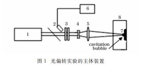 實(shí)驗(yàn)裝置的主體部分如圖1所示,脈沖Nd∶YAG激光1(波長1.06μm,脈寬10ns,最大激光能量500mJ)經(jīng)過分光鏡2,衰減片3和擴(kuò)束裝置4,由會(huì)聚透鏡5(焦距150mm)聚焦于銅靶7上。水槽8里裝有具有不同表面張力的液體。能量計(jì)6用來實(shí)時(shí)監(jiān)測入射激光的能量。實(shí)驗(yàn)中靶面焦斑半徑為50μm.