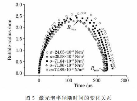 從圖5可以看出,表面張力減緩了空泡的膨脹過程。在初期,空泡膨脹變緩的現(xiàn)象不甚明顯,愈到后期越明顯。液體張力越大,空泡對應(yīng)的最大泡半徑越??;表面張力加速了空泡的收縮。表面張力越大,空泡收縮所能達(dá)到的最小泡半徑越小,且表面張力縮短了空泡脈動周期。從圖5還可以看出表面張力對空泡潰滅的影響要強(qiáng)于對膨脹的影響。此外,激光泡半徑隨表面張力變化與液體的表面張力數(shù)值并不為線性關(guān)系,其關(guān)系有待研究。