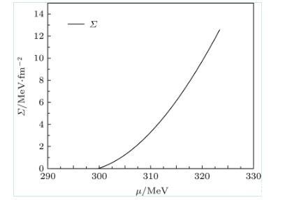 利用薄壁近似,圖2給出了當(dāng)T=Tc時(shí),夸克強(qiáng)子一級(jí)相變的表面張力隨夸克化學(xué)勢(shì)的變化??芍谝患?jí)相變區(qū)域,當(dāng)化學(xué)勢(shì)增大時(shí),強(qiáng)子相的表面張力也隨著化學(xué)勢(shì)增大。當(dāng)溫度接近零時(shí),強(qiáng)子夸克相變的表面張力約為12.6 MeV/fm2.在T→0的情況,本文理論預(yù)言與文獻(xiàn)一致,但該文獻(xiàn)只是考慮T=0的冷夸克物質(zhì)的夸克強(qiáng)子一級(jí)相變。