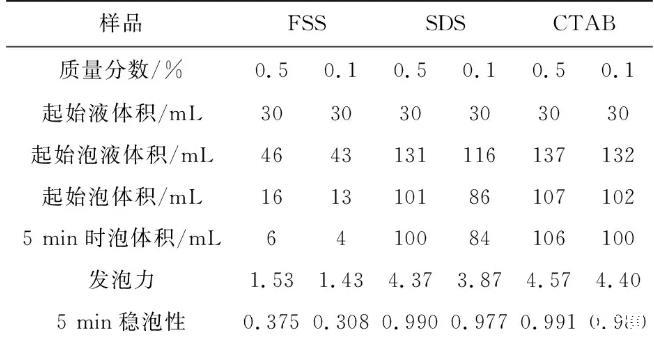 表1 FSS與SDS、CTAB的發(fā)泡力和穩(wěn)泡性比較