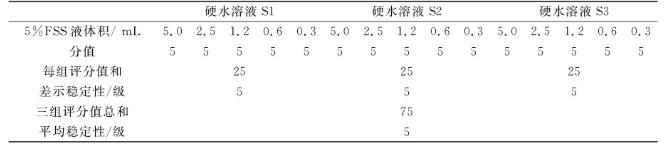 參照GB 7381-87所述方法,對(duì)合成得到的氟硅表面活性劑FSS在硬水中的穩(wěn)定性進(jìn)行了測(cè)定,結(jié)果如表3.