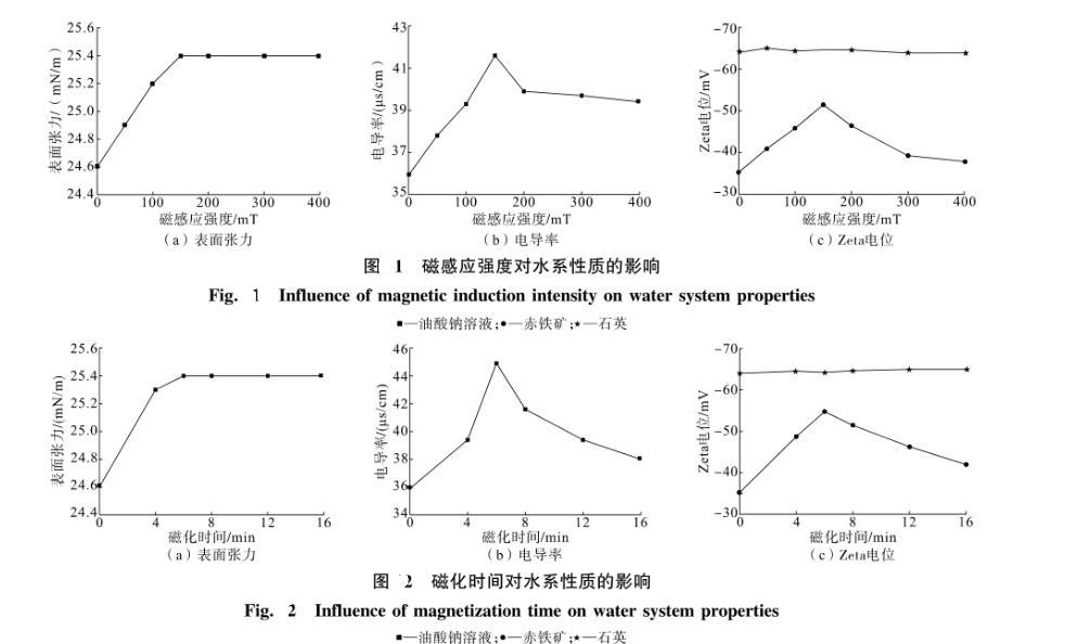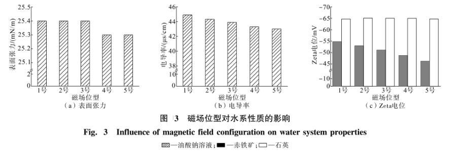 由圖3可知,1號磁場位型條件下,油酸鈉的表面張力、電導率和赤鐵礦的Zeta電位絕對值均最大。